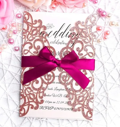 Dazzle your guests with the Hosmsua 20x Laser Cut Lace Rose Drill Wedding Invitation Cards from Jusman Creations Ltd. Featuring exquisite rose-gold glitter detailing, intricate lace patterns, and an elegant burgundy ribbon, these invitations exude romance and sophistication. Ideal for weddings, bridal showers, and glamorous events, they set the stage for a magical celebration. Order now and let your invitation sparkle!